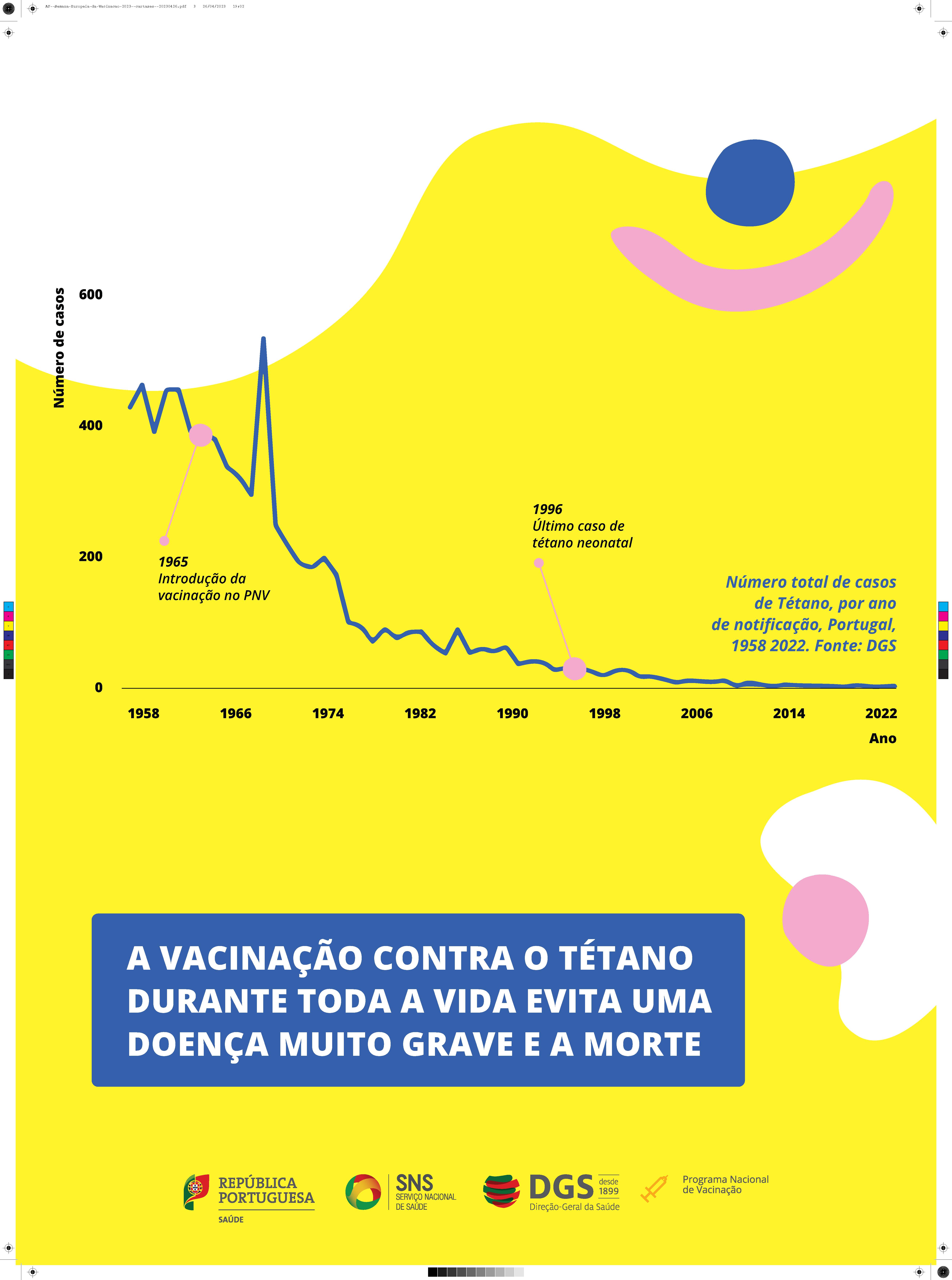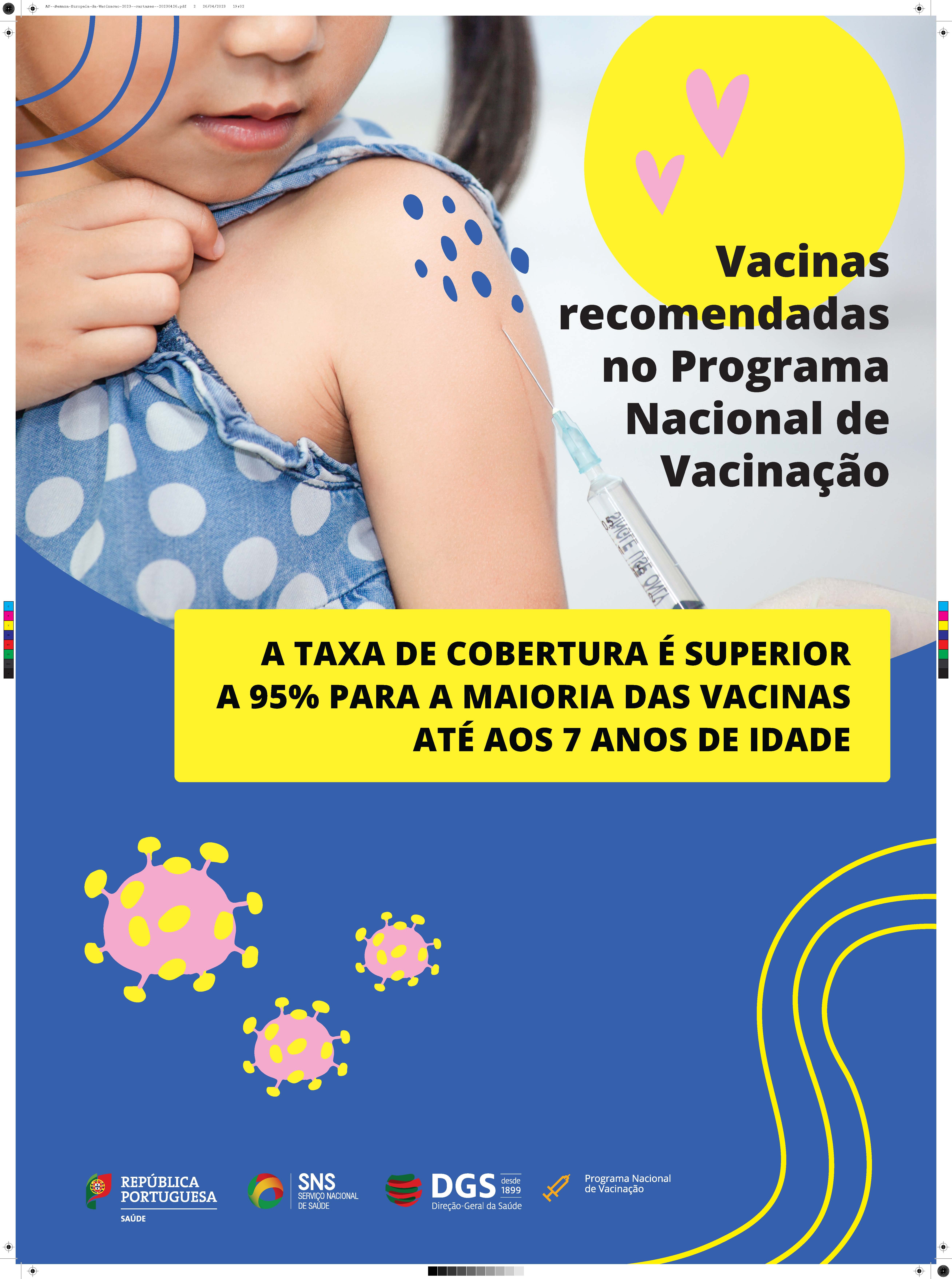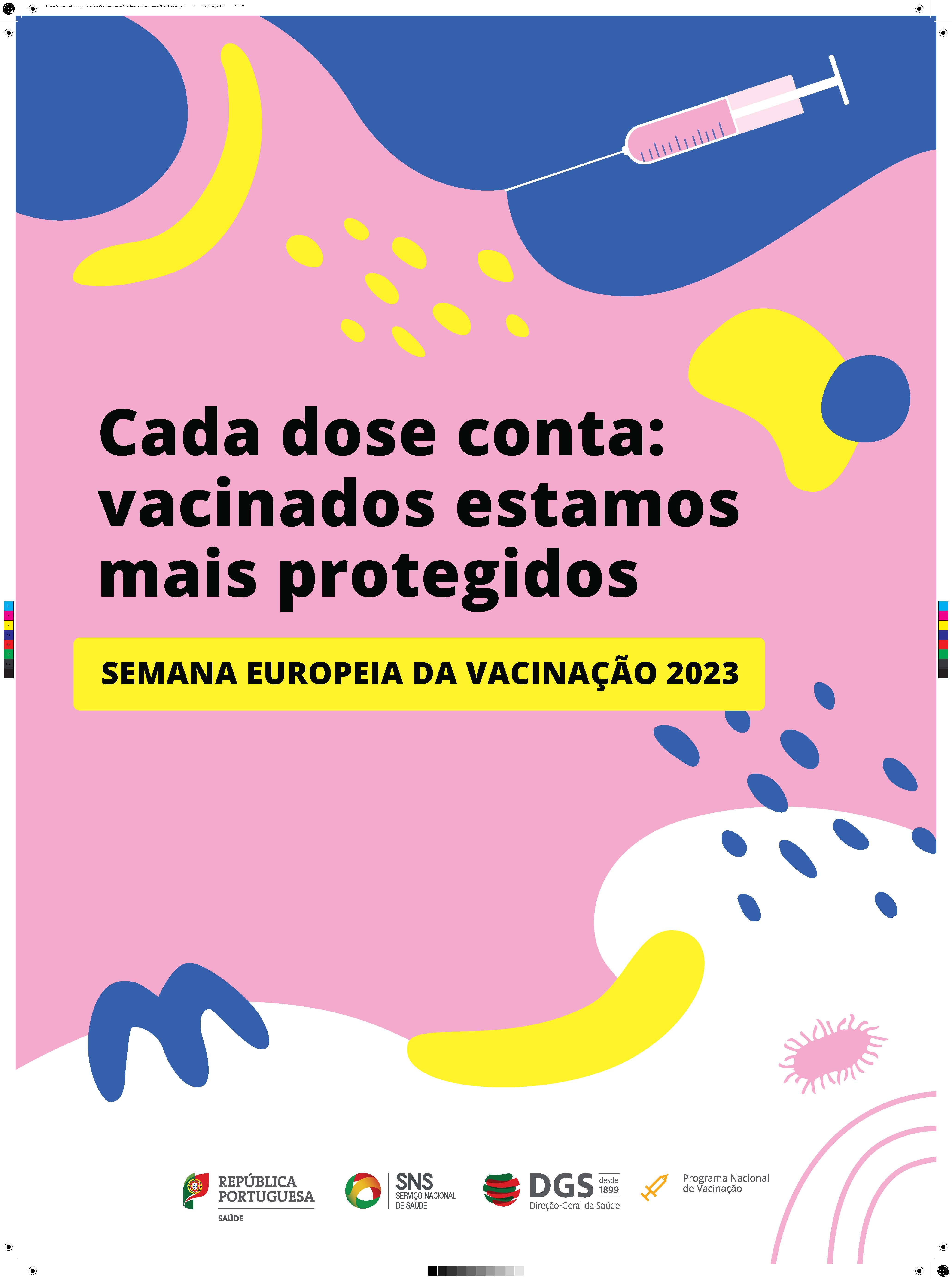 A Direção-Geral da Saúde associa-se à Organização Mundial da Saúde (Região Europa) para assinalar a Semana Europeia da Vacinação 2023. Ao longo de vários dias, promove uma campanha de comunicação com inúmeras iniciativas, entre elas um “Live” no Facebook e no Youtube, vídeos sobre a importância da vacinação, com testemunhos de utentes e profissionais de saúde, o Boletim da Vacinação com os dados anuais, e uma campanha digital.